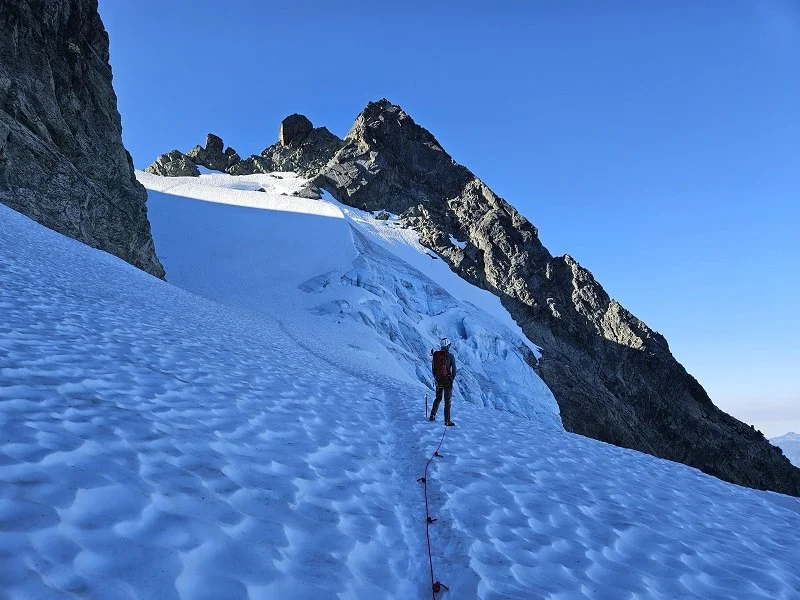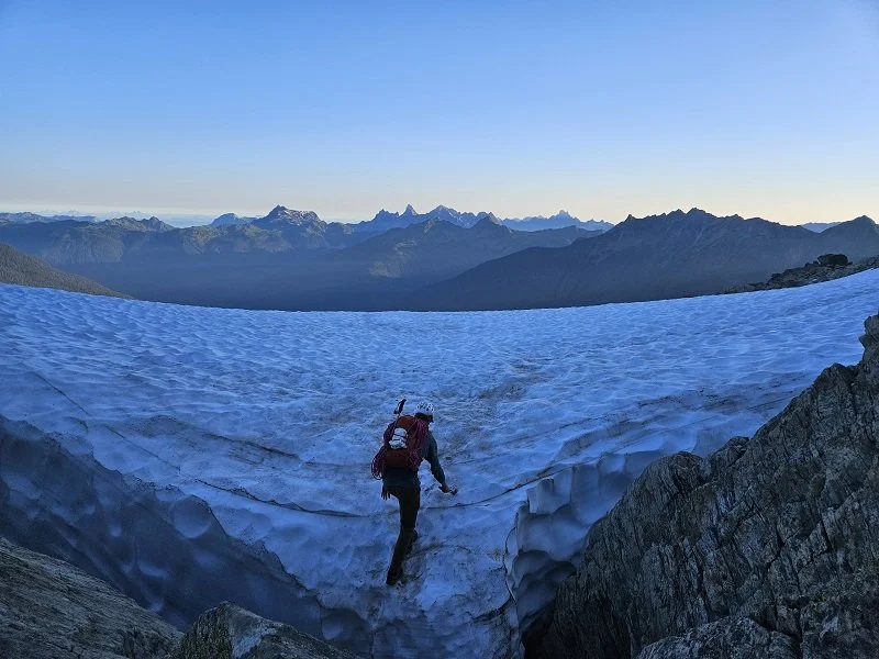 Time of year and conditions: Fisher Chimneys has a smallish window for “ideal” conditions. Trip reports through the years typically fall into late-July through late-August. Of course things can be drastically different year over year. Chris had found a Facebook post from a group that summited the week prior to us and it seemed like the route was in great shape. NPS also had some current info on route conditions: Climbing Conditions - Mt. Shuksan. All of this is a matter of preference and experience. For us, based on experience, it was important that the steep snow/glacier sections (Winnie’s Slide and Hell’s Highway) would be snow, and not exposed glacier ice. I found at least one report that was stoked for the potential of later season ice that appears as things melt out, live your truth.