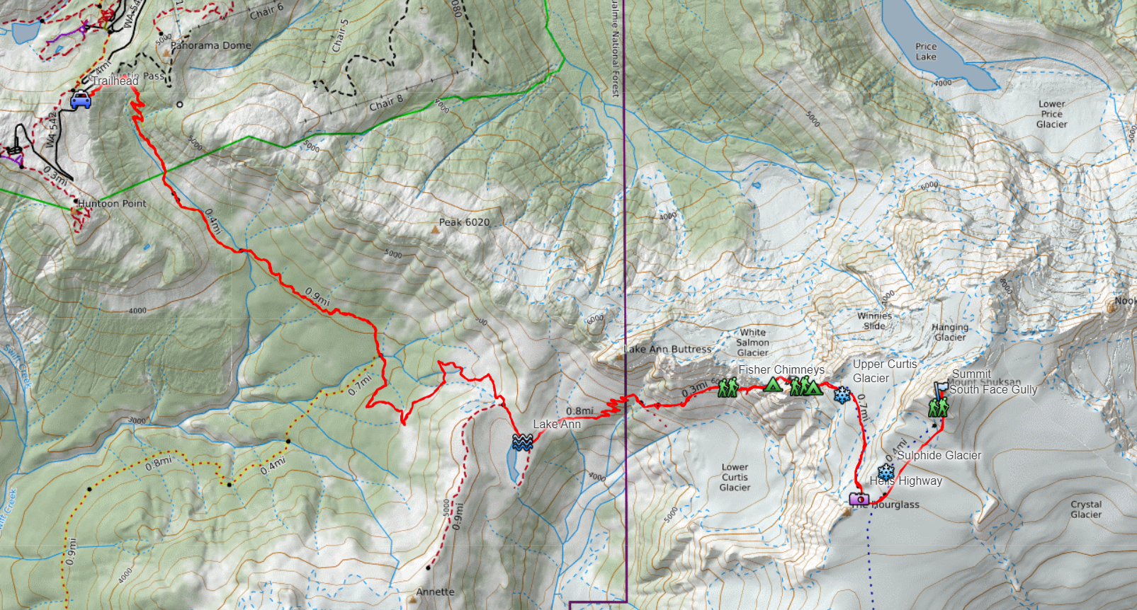 The campsites above and below Winnie’s Slide are beautiful and unique and while I love a good car to car push it would be worth staying the night to spend some more time up there, this requires a permit as it is within the National Park. Camping at Lake Ann is also a good permit-free option for shortening a summit push by a couple hours. For those with the necessary experience and skills, the SE Ridge is the right move compared to summiting via the standard gulley. But the trip with a gulley summit is certainly worth it in its own right.