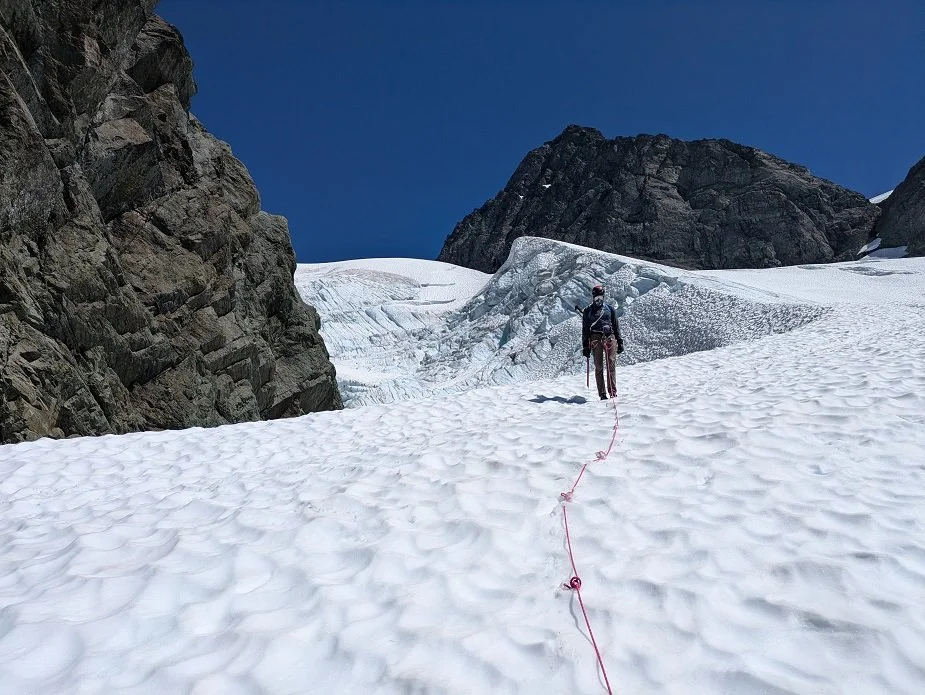 Base of the summit to the top of Hells Highway was very straightforward. We roped up after getting off the rock and walked in the same boot path we took up.