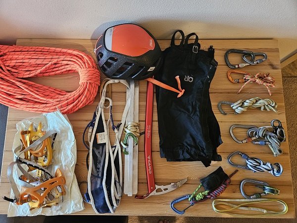 Rack for the SE Ridge Climb, some glacier gear overlaps with gear that was used on the climb: