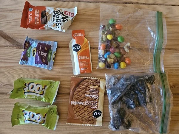Starting food. Only one of the salami, cheese, and butter sandwiches was mine. I also started with 2 scoops of Gnarly Fuel 2o in my bladder. In the bags is fruit and nut trail mix with peanut m&ms added, and mini oreos.