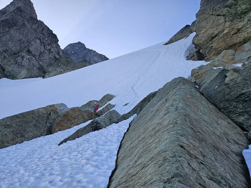 After topping out Hells Highway we merged with some climbers coming from the Sulphie Route. This section is a straightforward glacier slog to the summit block. There were some cracks opening up that the bootpack moved around. There is a photo below of the snow levels as we approached the summit block. The main bootpack went up the snow towards the gulley route, we turned right off the main path to gain the SE ridge when we spotted a potential transition point. Continuing to follow the standard route a bit higher through the snow would likely also give access to the SE Ridge