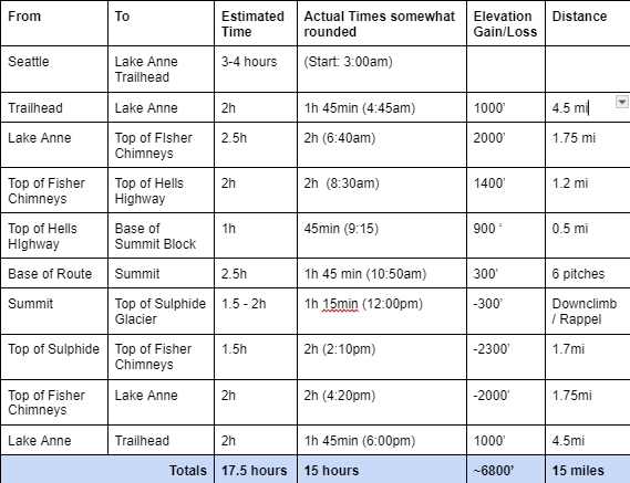 Quick intro: The purpose of this is to provide some objective information on our planning for and trip up Shuksan, to help others also have a successful day in the mountains. There is a ton of info out there on the Fisher Chimneys and the SE Ridge. I read multiple trip reports, watched a couple videos, and read route descriptions on various sites. Chris and I have a planning template that we have used in the past that has worked well. We collaborate there on anything from weather forecasts to gear lists.